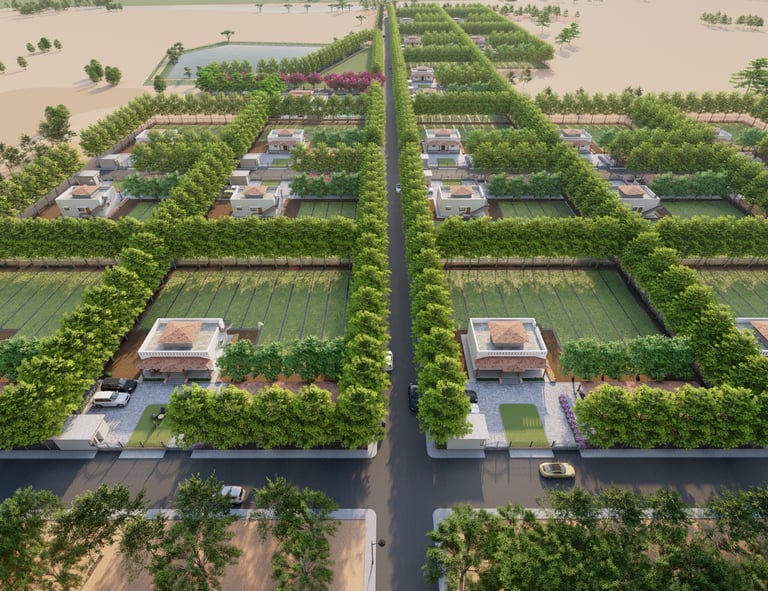 This visionary project by Gamy Associates creates the serene and sustainable Arogya Garden community. Lush gardens and farms surround homes, offering fresh produce. It’s just a 5-minute walk to the bus stop and a 10-minute drive to schools. Located in a peaceful, child-friendly neighborhood, Arogya Garden provides space for family activities and gatherings with friends.